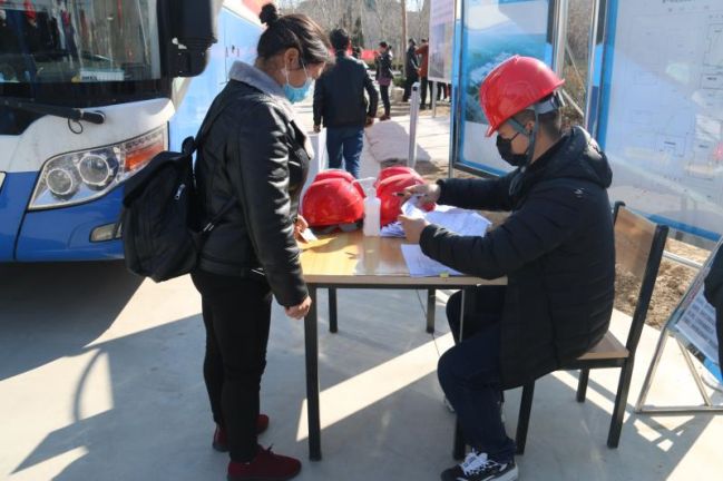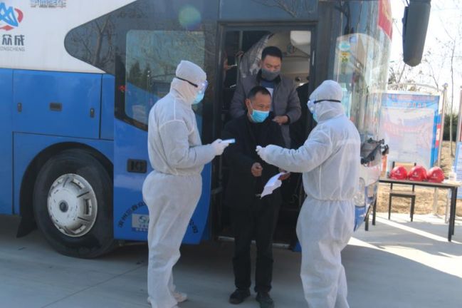 為保障四川工友的安全返程,城建集團特派專車“點對點”赴四川接工友復工。3月4日下午,一輛載有21名四川工友的大巴車緩緩停在惠眾標準化廠房項目的門口,工友們依次下車接受體溫檢查、登記入場。